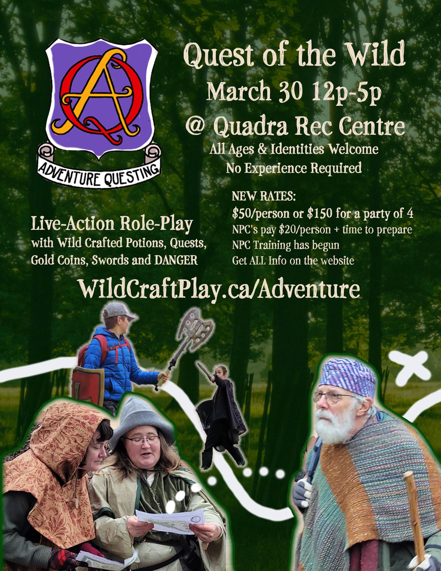 Adventure Questing is a day of adventure. Arrive in your character kit, prepare to mingle, purchase, prepare for a quest, scheme and swindle. Training in the Sword and Spell Casting commences after registration closes.